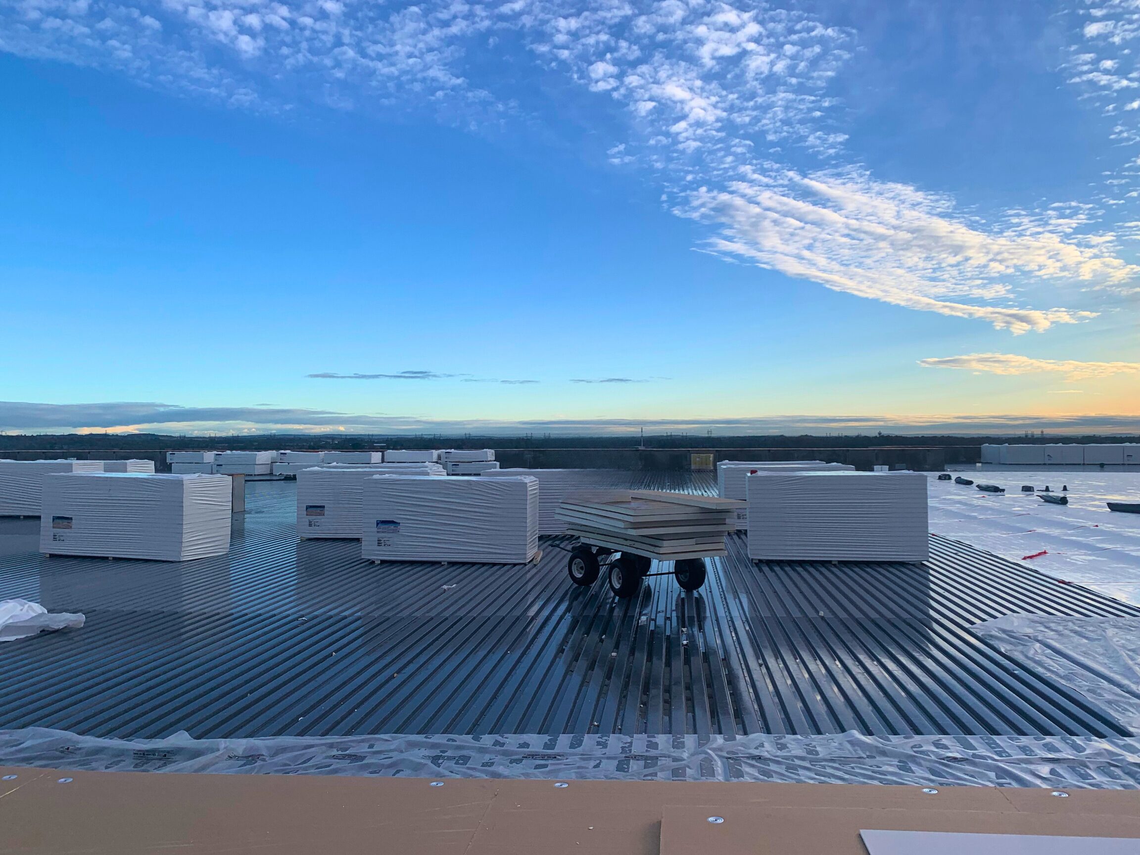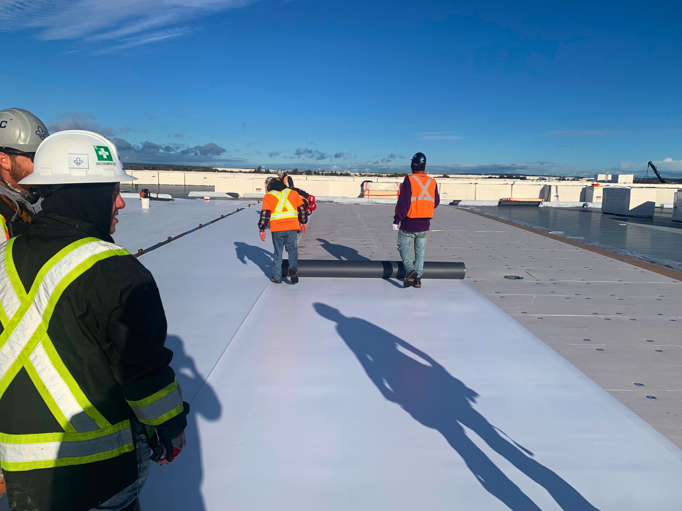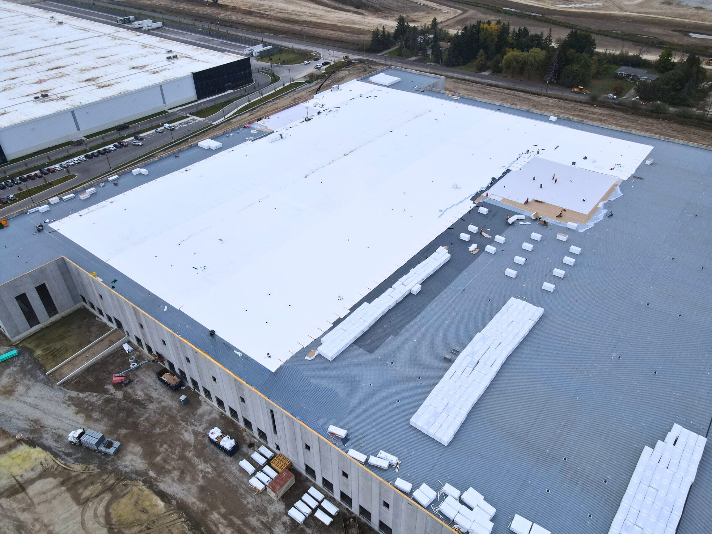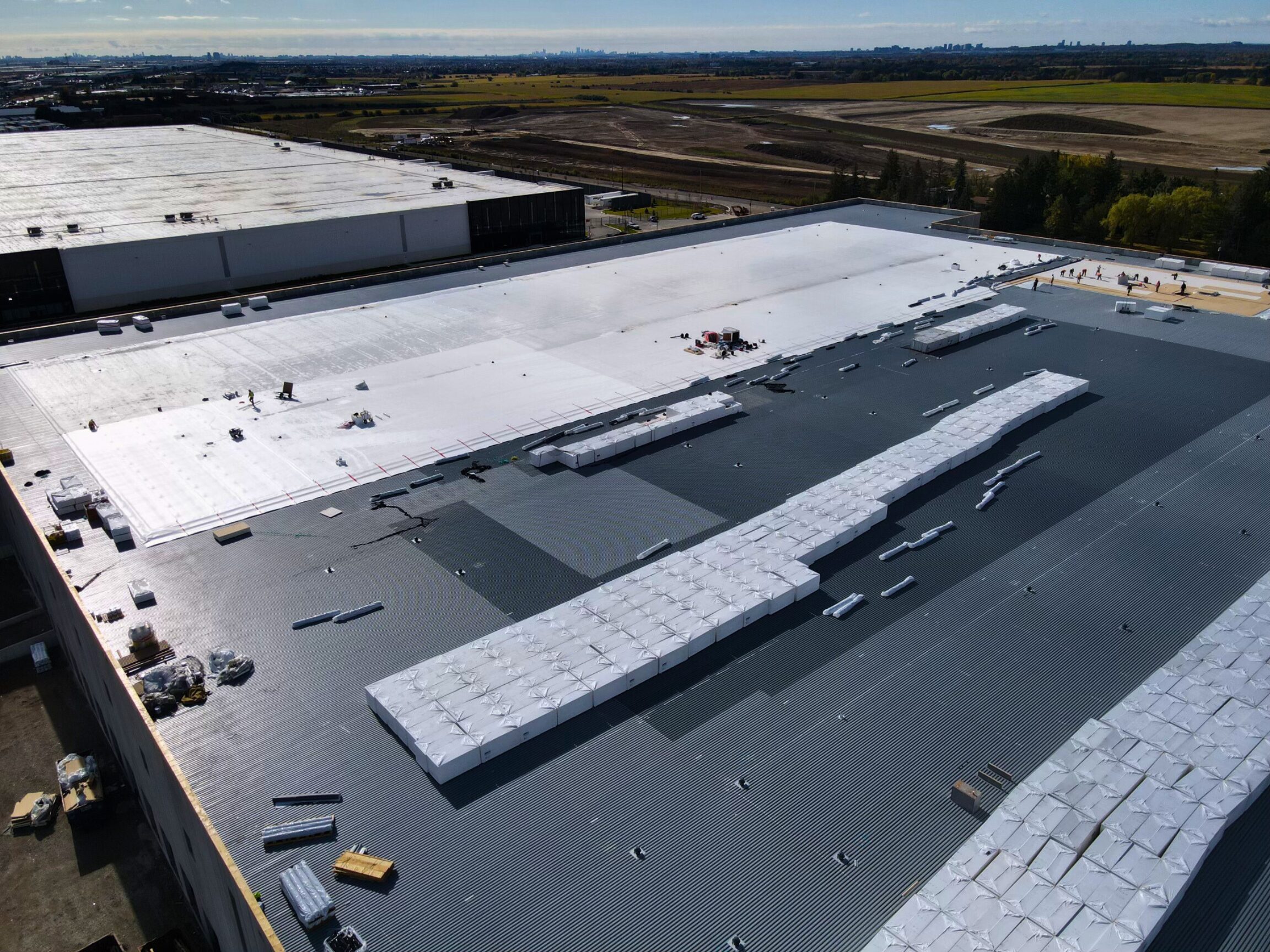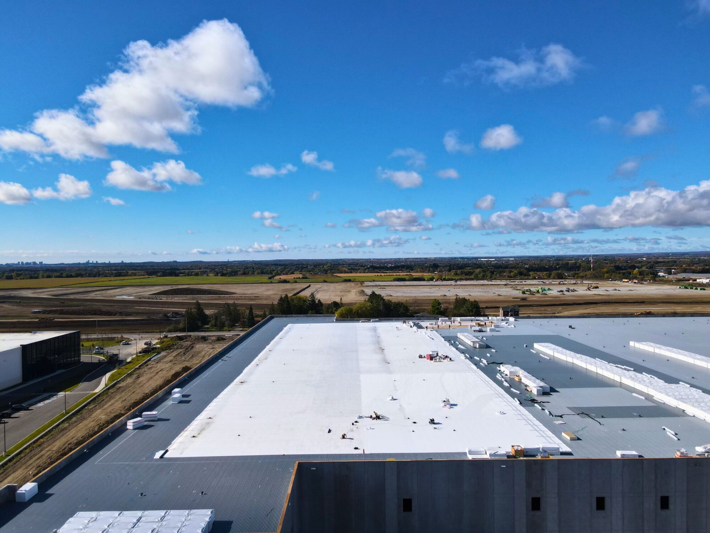 Empire delivered the flat industrial roofing scope for Prologis Park’s DC2 & DC3—two Class-A distribution facilities totaling ~1.2 million sq. ft. in the Greater Toronto Area. Partnering with General Contractor Leeswood Construction and JM Roofing Supplies, we installed a TPO flat industrial roofing system designed for durability and energy efficiency. The assembly includes a continuous vapour retarder, high-R tapered polyiso insulation, and protective coverboard, with solar-ready detailing, resilient perimeter and penetration flashings, and TPO walkways for safe service access. The result is a robust, low-maintenance roof envelope backed by a 20-year NDL system warranty, purpose-built for modern logistics operations in the GTA.